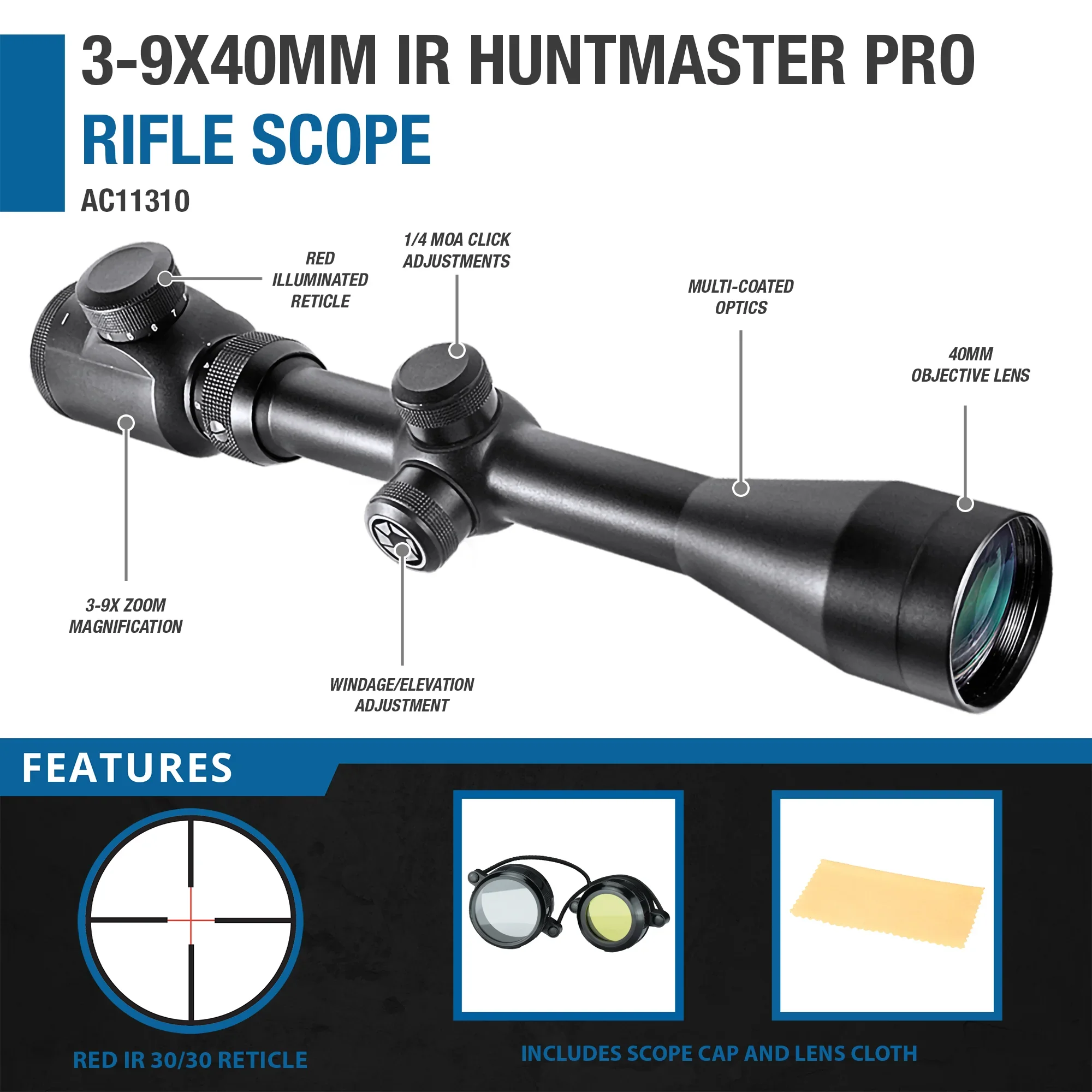 Sale! Barska Huntmaster Pro 3-9×40 IR Scope$199.99 Original price was: $199.99.$110.00Current price is: $110.00. Tax included. Shipping calculated at checkout. 1 in stock Barska Huntmaster Pro 3-9x40 IR Scope quantity Add to cart Buy Now SKU: AC11310 Categories: Optics & Scopes, Scopes Tags: 3-12x50mm scope, AC10056, Barska Huntmaster Pro scope, Hunting Scope, Varmint Scope Barska Huntmaster Pro 3-9×40 IR Scope The 3-9x40mm Huntmaster Pro IR 30/30 Rifle Scope by Barska is a perfect choice for serious shooters and hunters who are looking for the most essential features of a rifle scope at a very affordable price. Share on Twitter Pin it Most Popular BMT Equipped Mooner – N38-8 $224.00 Quick ViewBuy Now Browning Ammo .22lr BPR 40gr Lead HP (100) 1435fps $24.93 Quick View Bertram Bullet Company Unprimed Brass Cases .303British $29.99 Quick View Smith & Wesson M&P9 Magazine 10shot $109.99 Quick View