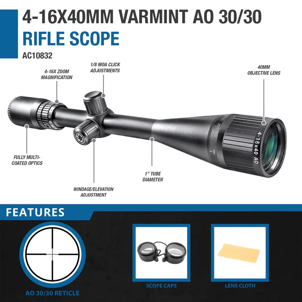 The 4-16x40mm Varmint AO 30/30 Rifle Scope by Barska is the scope you want when precision is a critical factor. The Varmint rifle scope series gives you the advantage with long-range and deadly accurate targeting.